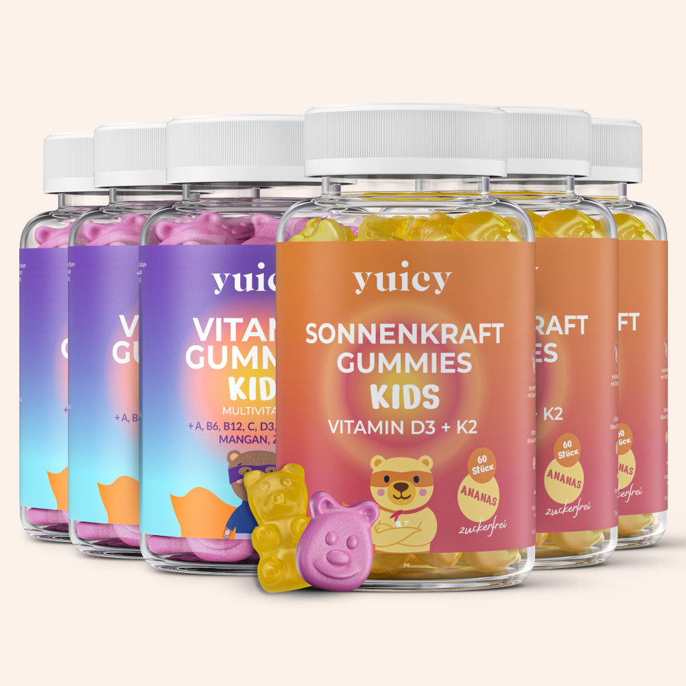 Hey, suchst du nach einer leckeren Möglichkeit deine Kinder mit den notwendigen Vitaminen und Nährstoffen zu versorgen? Dann sind unsere yuicy® Kids Gummies die perfekte Lösung für dich und deine Kleinen! Diese Vitamin Gummibärchen sind nicht nur super lecker mit ihrem Waldbeeren-Geschmack, sondern auch gesund, vollgepackt mit essentiellen Vitamine für Kinder, einschließlich Vitamin D, das für das Knochenwachstum und die allgemeine Gesundheit wichtig ist. Gib deinen Kindern einen köstlichen Snack, der gleichzeitig ihre Gesundheit unterstützt. Schnapp dir jetzt deine Packung yuicy® Kids Gummies!